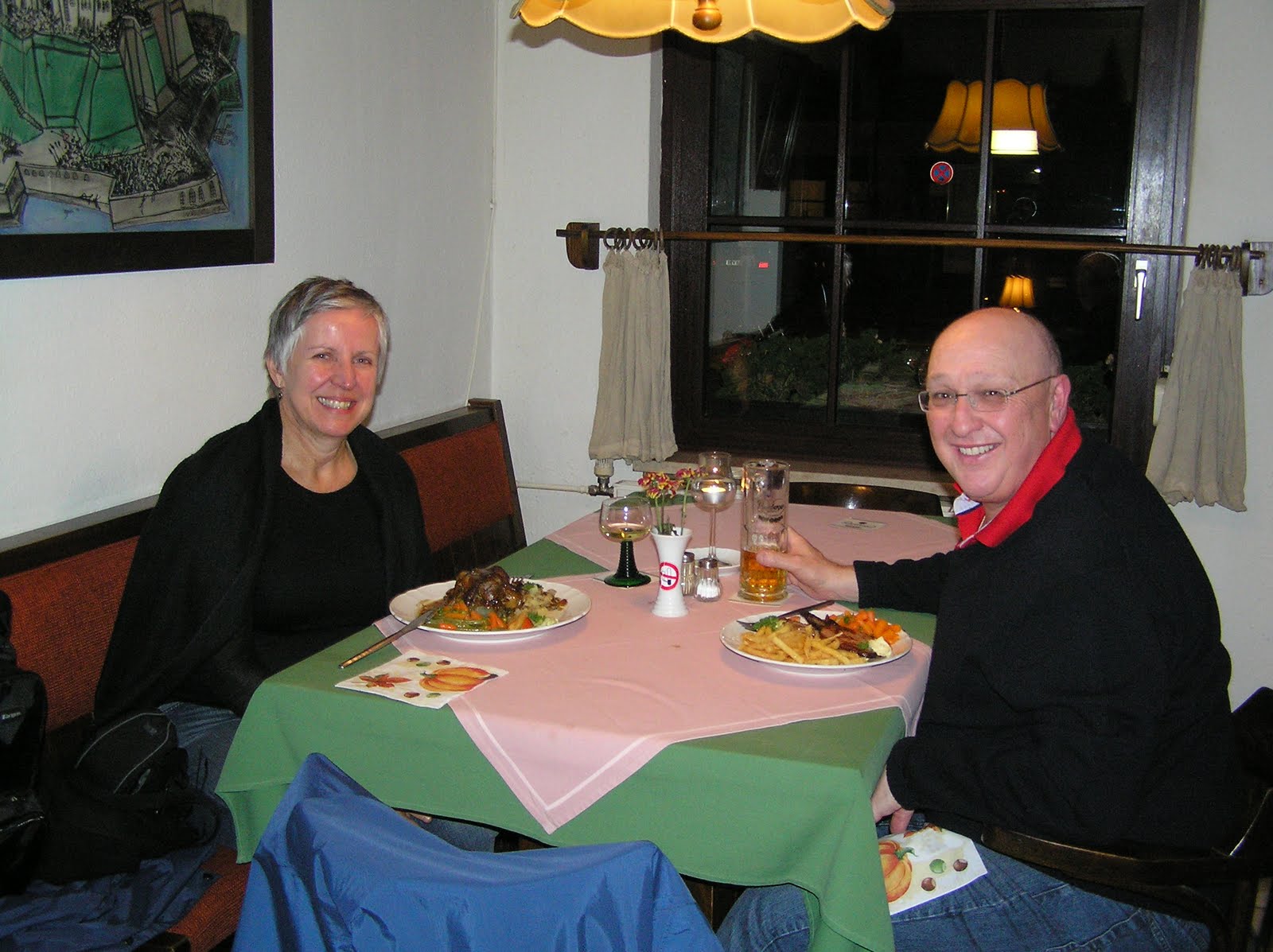 Dinner in typical German pub – pork knuckle and mixed grill, German white wine and of course German beer