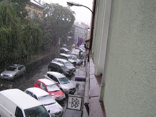 View outside our apartment window – snowing!