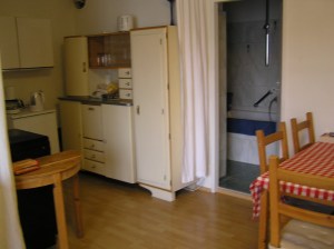 Kitchen and view into bathroom with washing machine and drying line