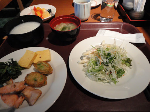 Buffet breakfast on the ground floor was Japanese but enough variety – breads, salads, noodles, congee, rice, miso soup, fish, sausages, bacon, scrambled eggs, fruit both tinned and fresh, yoghurt, brown tea(hojicha – Japanese ordinary tea), coffee, juices, vinegar, milk, yoghurt drink.